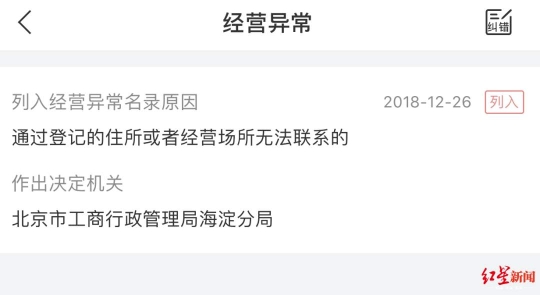 红星新闻记者通过企查查显示,该公司被列入经营异常名录原因是,“通过登记的住所或经营场所无法联系的”,作出决定机关为北京市工商行政管理局海淀分局。